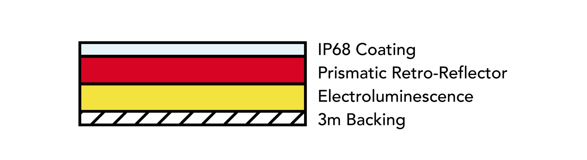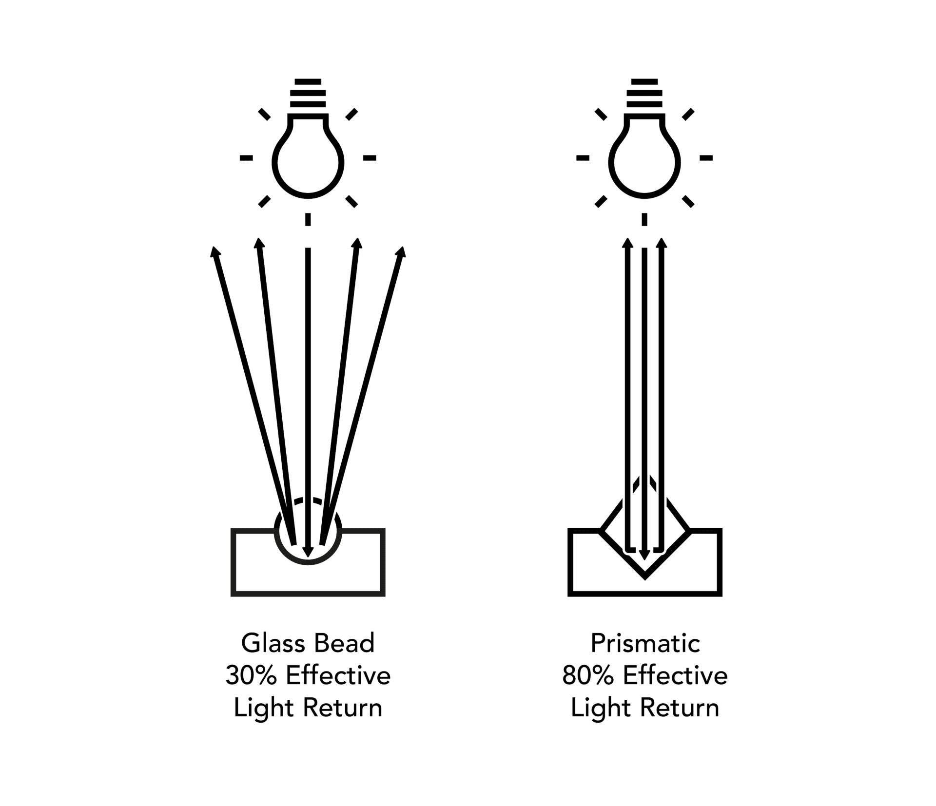 We exclusively use superior prismatic retro-reflective technology, that has been proven to return 80% of the light that it recieves, whereas glass-bead only returns 30%.
